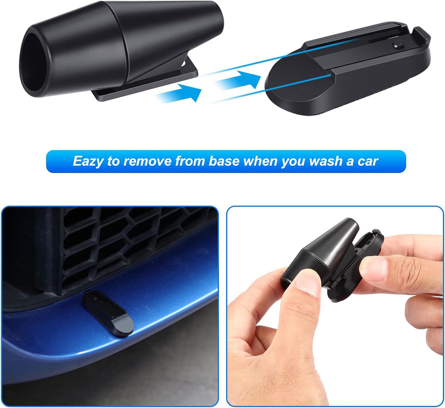 - Лесен за инсталиране и премахване: просто отлепете лепилния слой и поставете свирките върху решетката, предната броня, огледалото за обратно виждане или всяко плоско място на вашия автомобил; Уверете се, че по-големите глави са обърнати напред и свирката на елена е на нивото на хоризонта; Идеалното място е мястото, където въздухът циркулира най-много, следва решетката, предната щанга, лесно се свалят от основата, когато колата трябва да се измие.