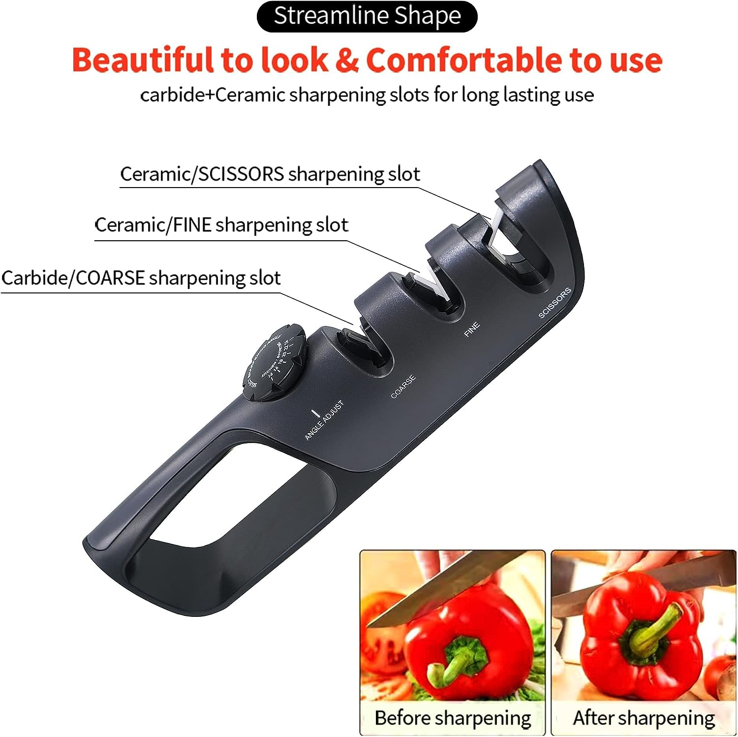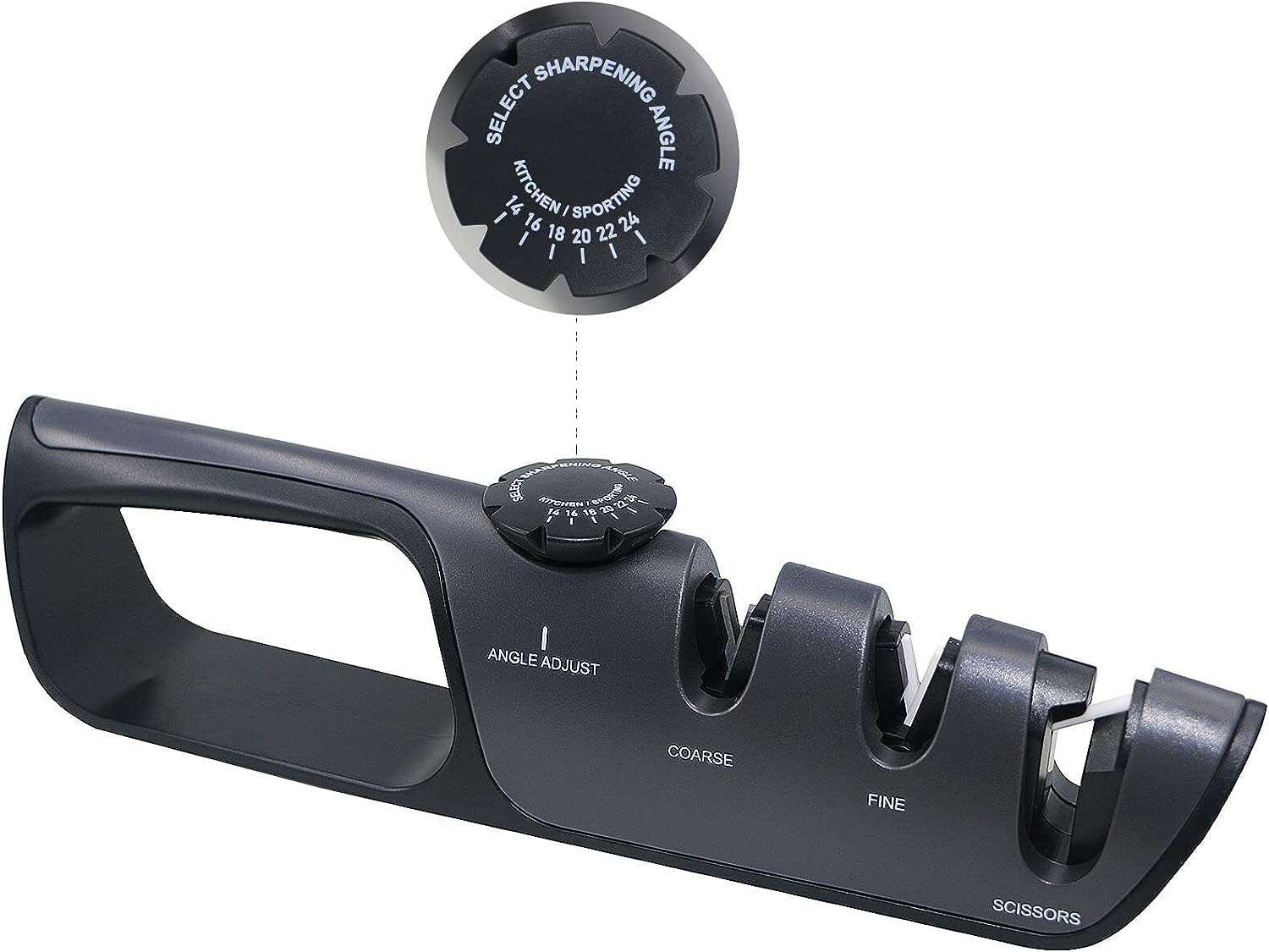 - Вградено копче за регулиране на ъгъла за професионална машина за заточване на ножове: Копче за регулиране на ъгъла от 14 до 24 градуса, така че можете да зададете правилния ъгъл на острието, за да заточите ножове с различни размери, дебелини и ръбове до правилния ръб.