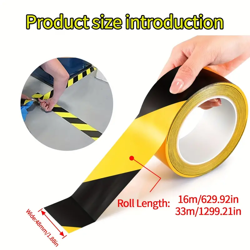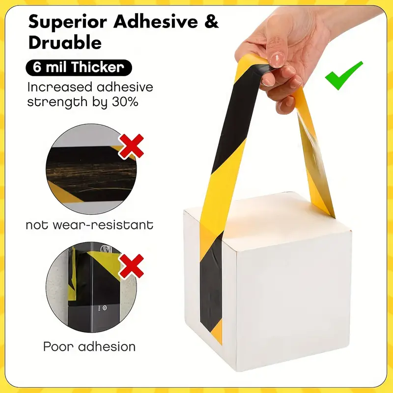 Висококачествена лента: Лентата за маркиране на пода е изработена от пластифициран поливинилхлорид (PVC) като основен материал, покрита с висококачествено лепило от естествен каучук и с издръжливи свойства.