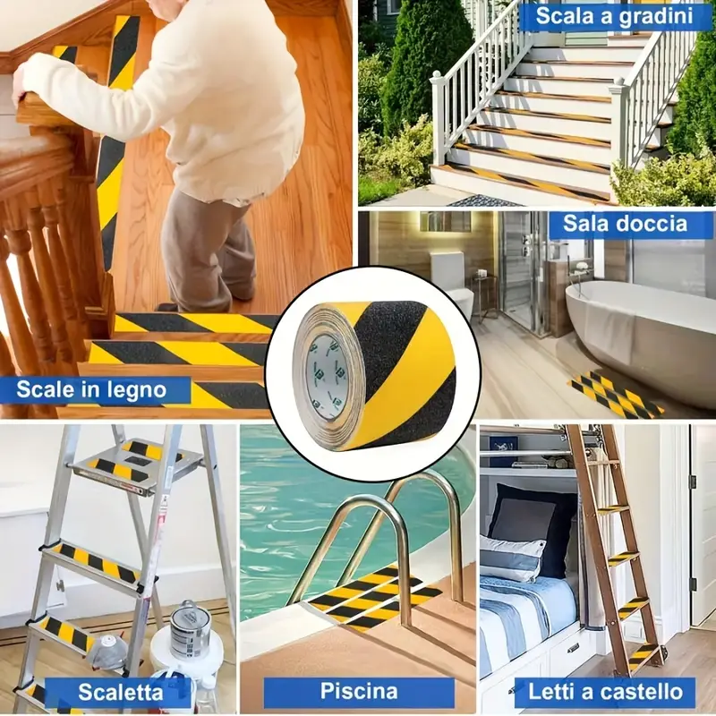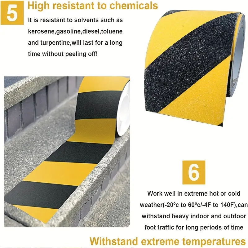 Нашите ленти против плъзгане имат плътно, агресивно акрилно лепило, което ще образува здрава, водоустойчива връзка към гладки повърхности, включително бетон, метал, пластмаса, дърво, плочки, камък, ламинат. Тази лента е устойчива на атмосферни влияния и вода, което я прави идеална за закрепване на стъпала, стълби, рампи, ремаркета, вътрешни дворове и друго оборудване за безопасност. Лесен за монтаж.