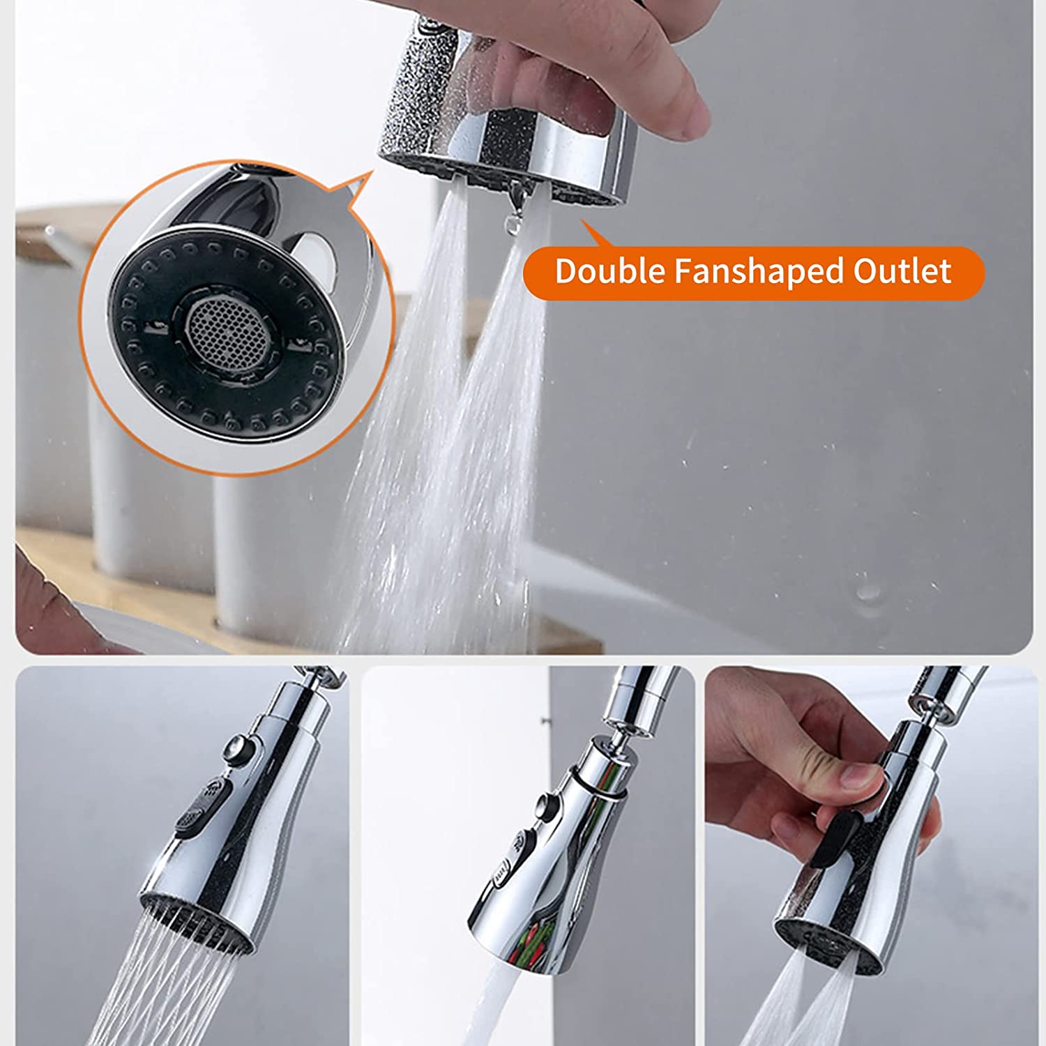 - Приставка за въртящ се на 360° кран: Аераторът на 360° въртящ се кран може да достигне до всеки ъгъл на банята или кухненската мивка, което улеснява измиването, водата може лесно да покрие цялата мивка, за да почисти целия ъгъл на мивката и да почисти съдовете . , тенджера, тенджера, плодове, зеленчуци и др.