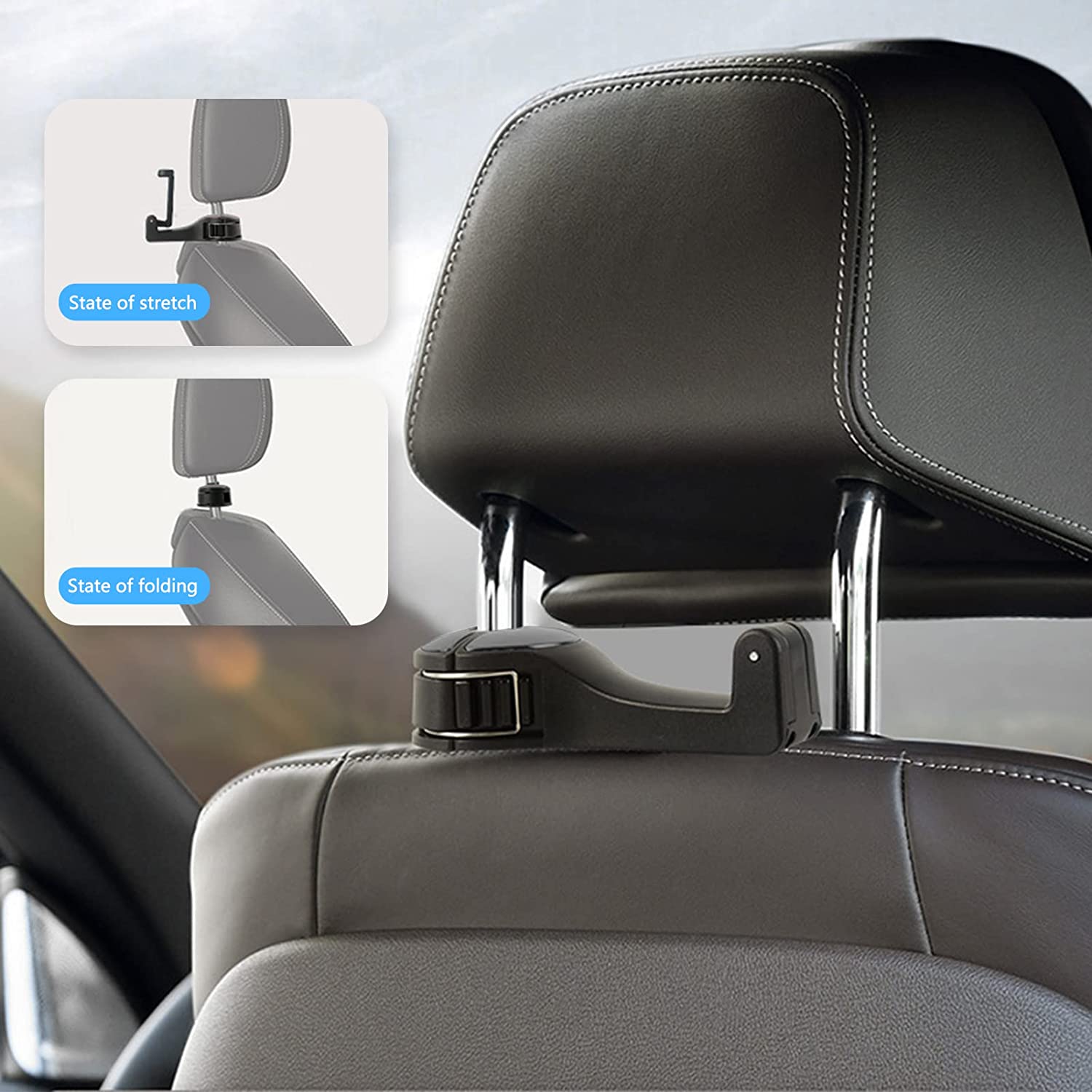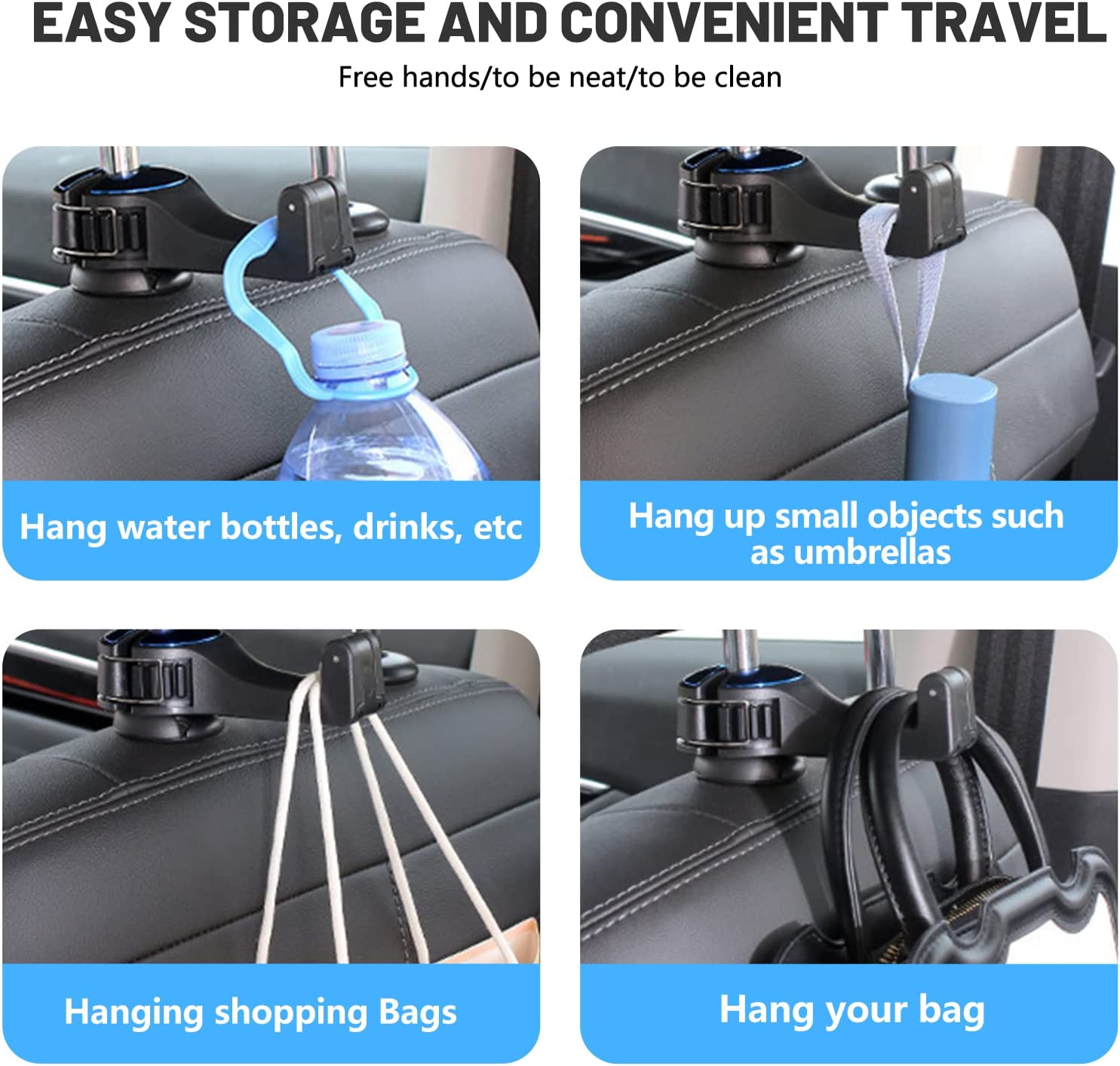 - 【Пестящо място и практично】: Държачът за столче за кола е идеален за окачване на портмонета, ръчни чанти, чанти за хранителни стоки, дрехи, чадъри, бутилки с вода и др. Направете колата си по-чиста и удобна.