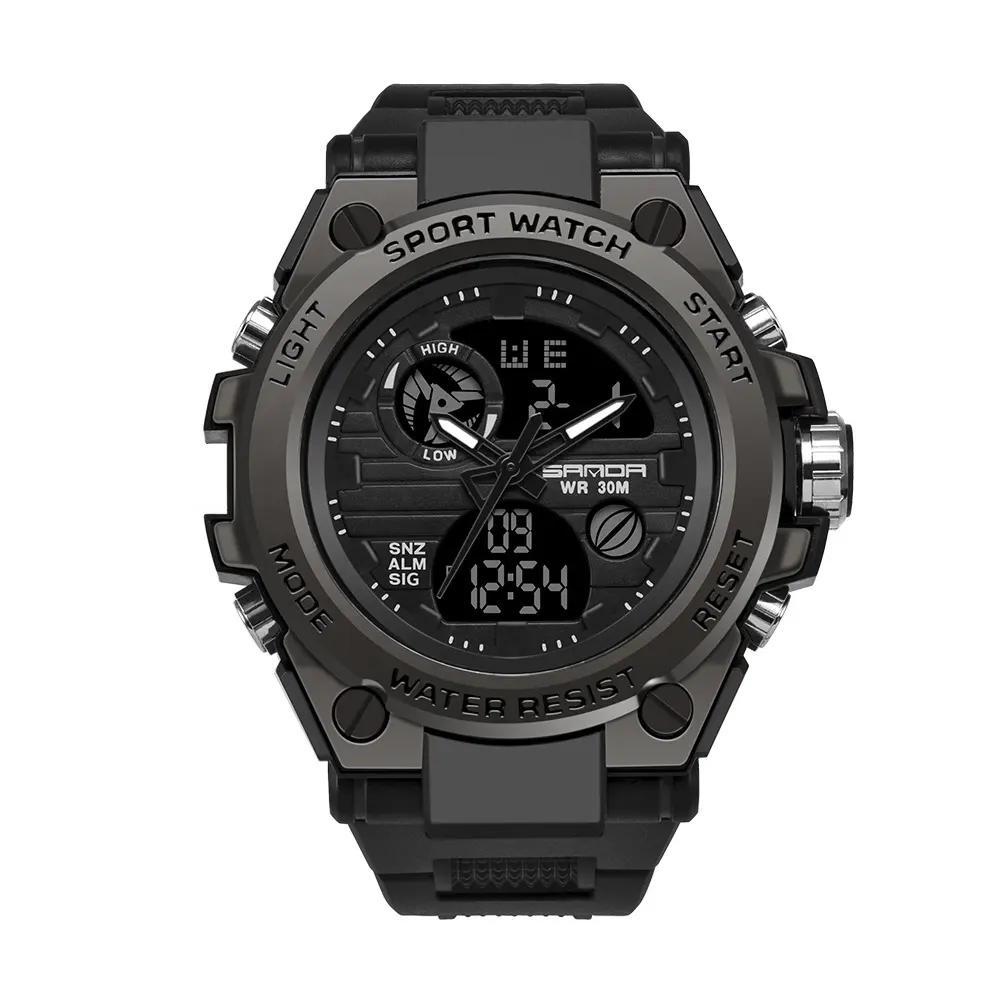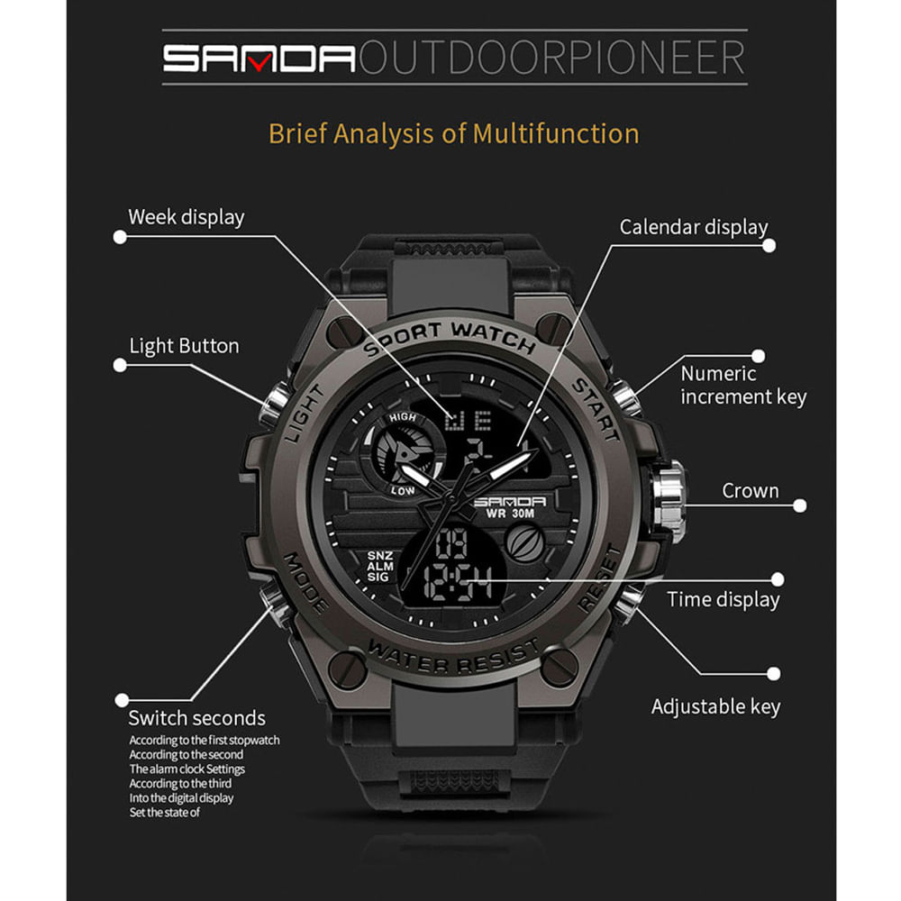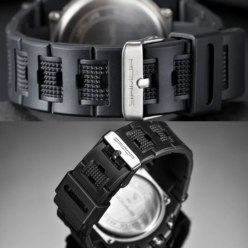 Изберете спортния часовник SANDA за здрав стил и максимална функционалност! Този часовник перфектно съчетава аналогов дизайн с цифров дисплей, като ви дава цялата важна информация с едно щракване. Идеален за спортни дейности или за ежедневна военна визия, той е вашият надежден партньор всеки ден.