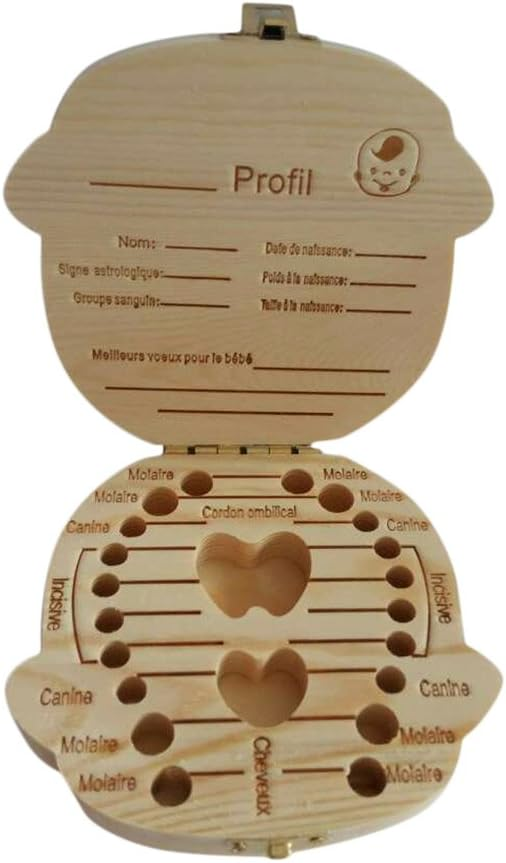 Специално отделение: Във вътрешността на кутията има специално място за записване на информация за вашето дете. Кутията може да се използва и за съхранение не само на млечни зъбки, но и на пъпна връв и лануго (първо мъхче на бебето).
