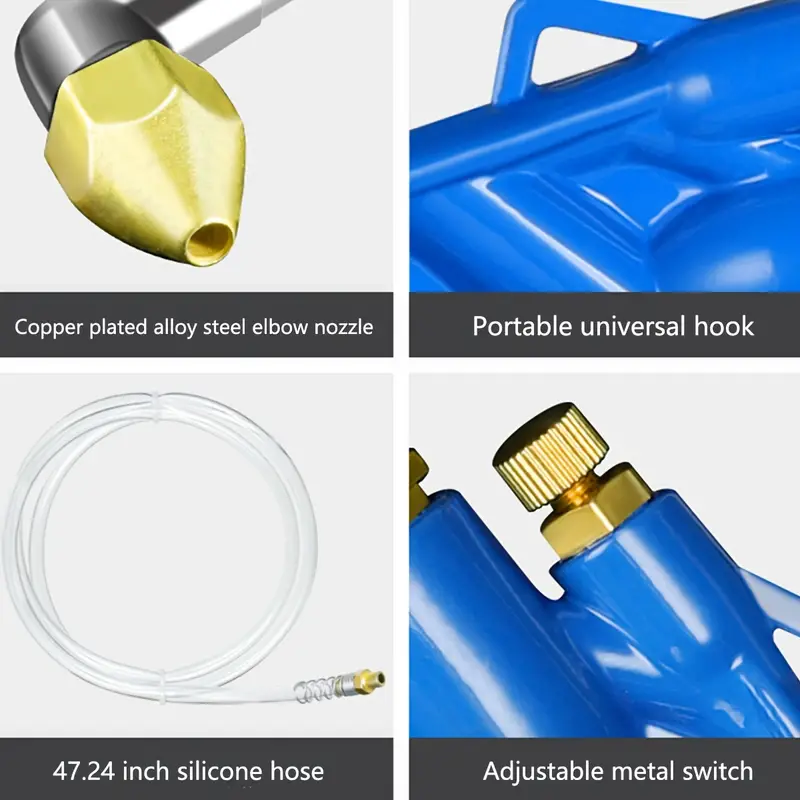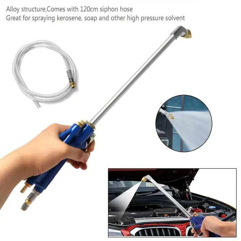- Разнообразна употреба: Работи със сгъстен въздух и може да пръска вода, сапуни и други разтворители за почистване на замърсени повърхности в двигателя, работилницата, улуците или палубата. Перфектен за употреба с керосин и други обезмасляващи разтвори (не се препоръчва за боя).