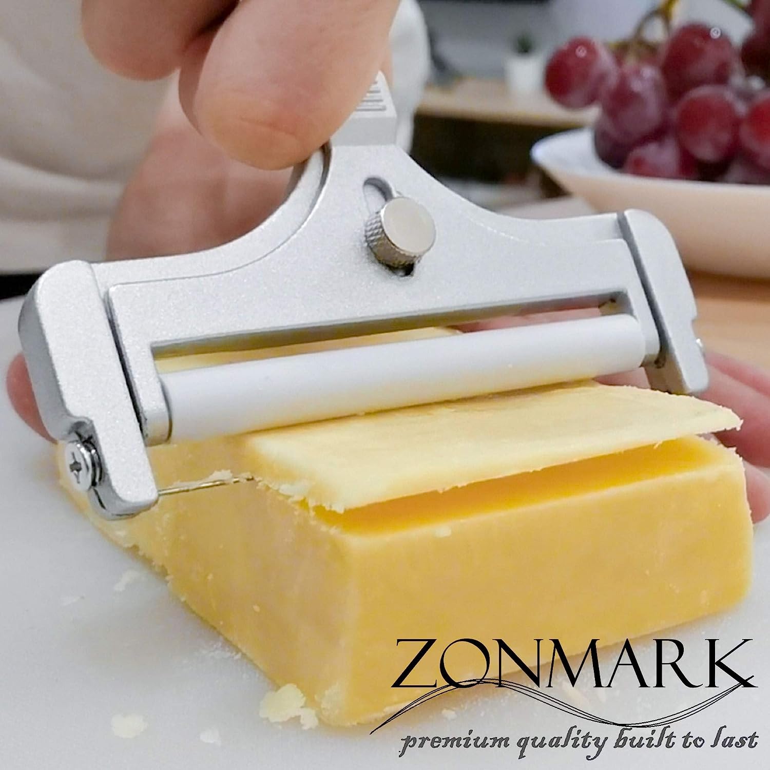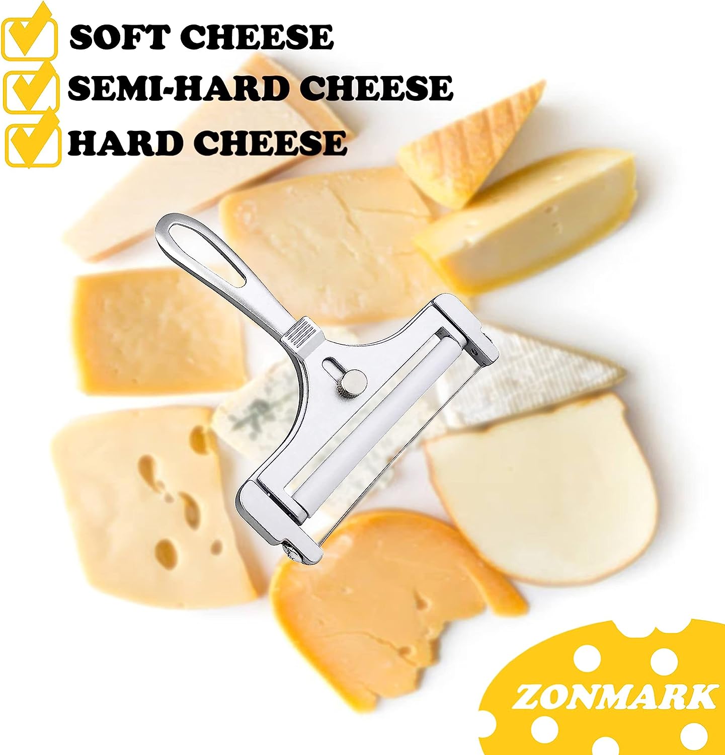 - Резачка за сирене с регулируема дебелина: Телените резачки за сирене режат красиви филийки с идеалната дебелина. Дебели, тънки или дори тънки като хартия филийки - зависи от вас с резачката за сирене с регулируем ъгъл!