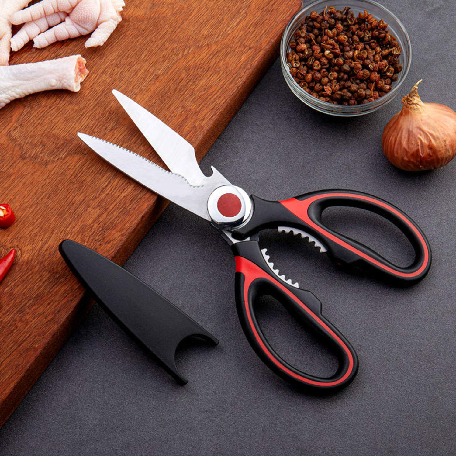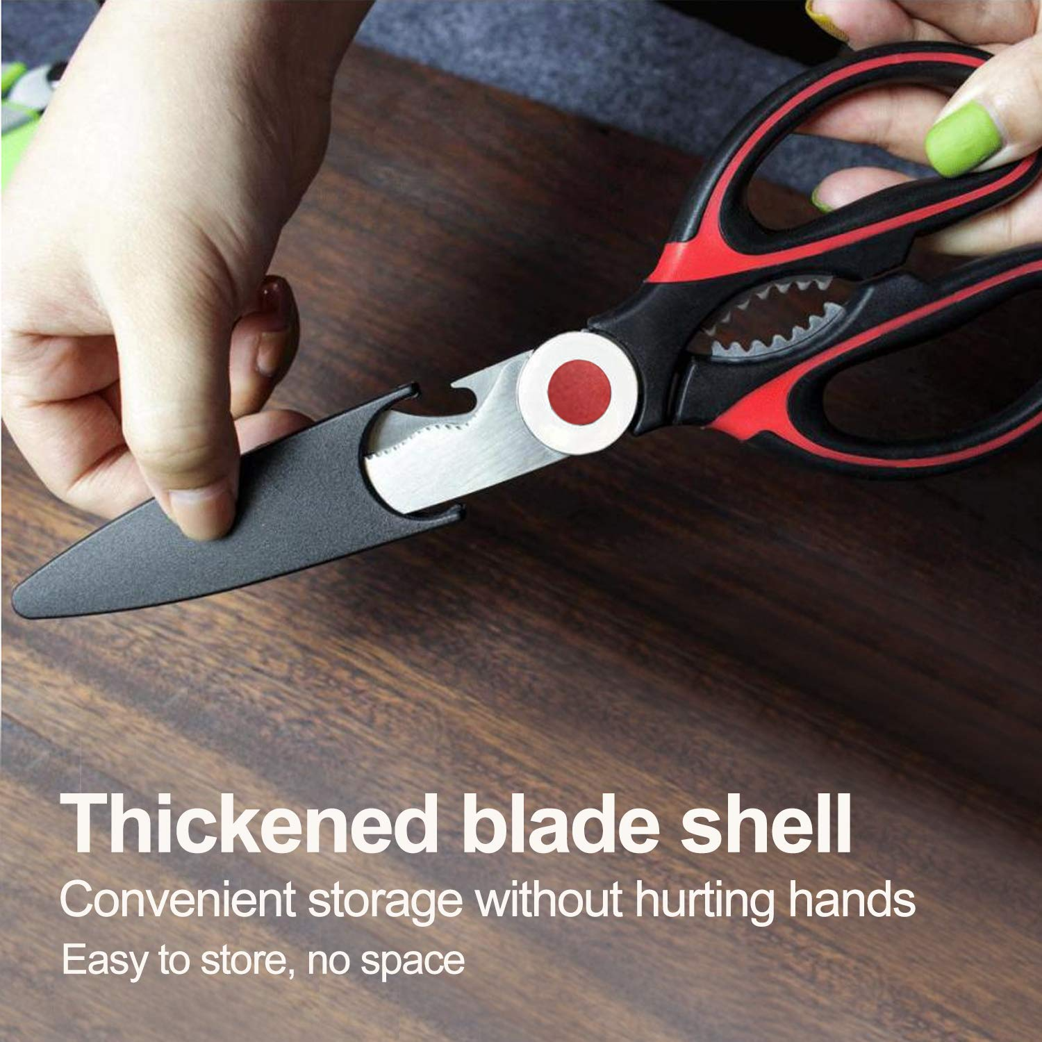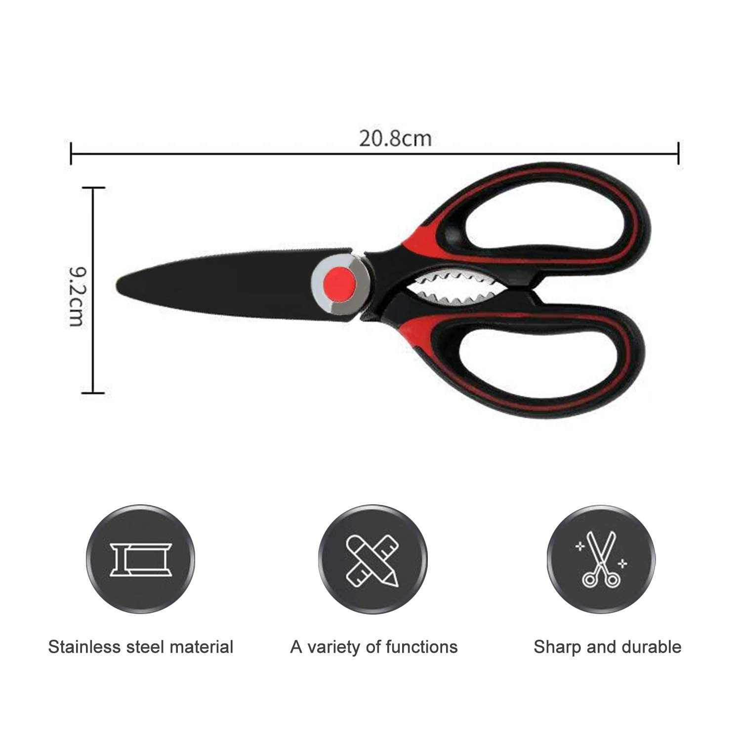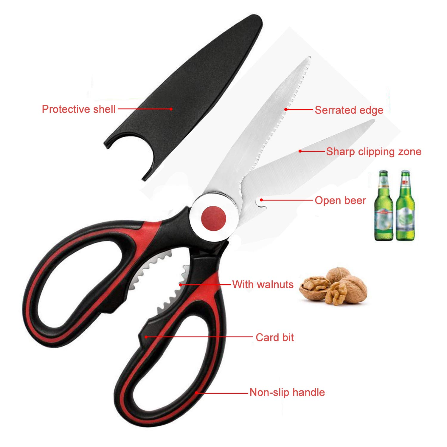 - 【 БЕЗУПРЕЧНО ИЗПЪЛНЕНИЕ ЗА КУХНЕНСКИ ЗАДАЧИ 】 Тези кухненски ножици са подходящи за широк спектър от кухненски задачи, включително рязане на месо, пуешки и пилешки кости. Те могат да се използват и за мащабиране на риба, нарязване на зеленчуци и плодове, нарязване на юфка и дори нарязване на пица. С тези ножици "всичко в едно" вече не се нуждаете от отделни инструменти, което носи повече удобство в работата ви в кухнята.