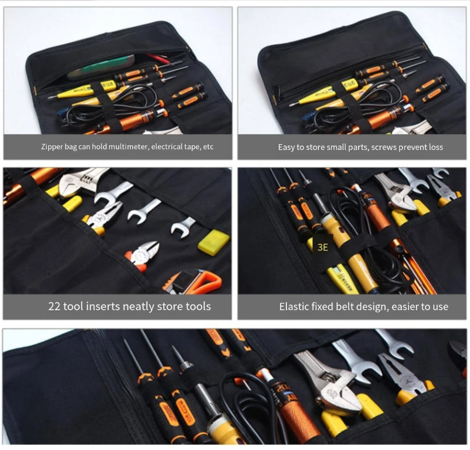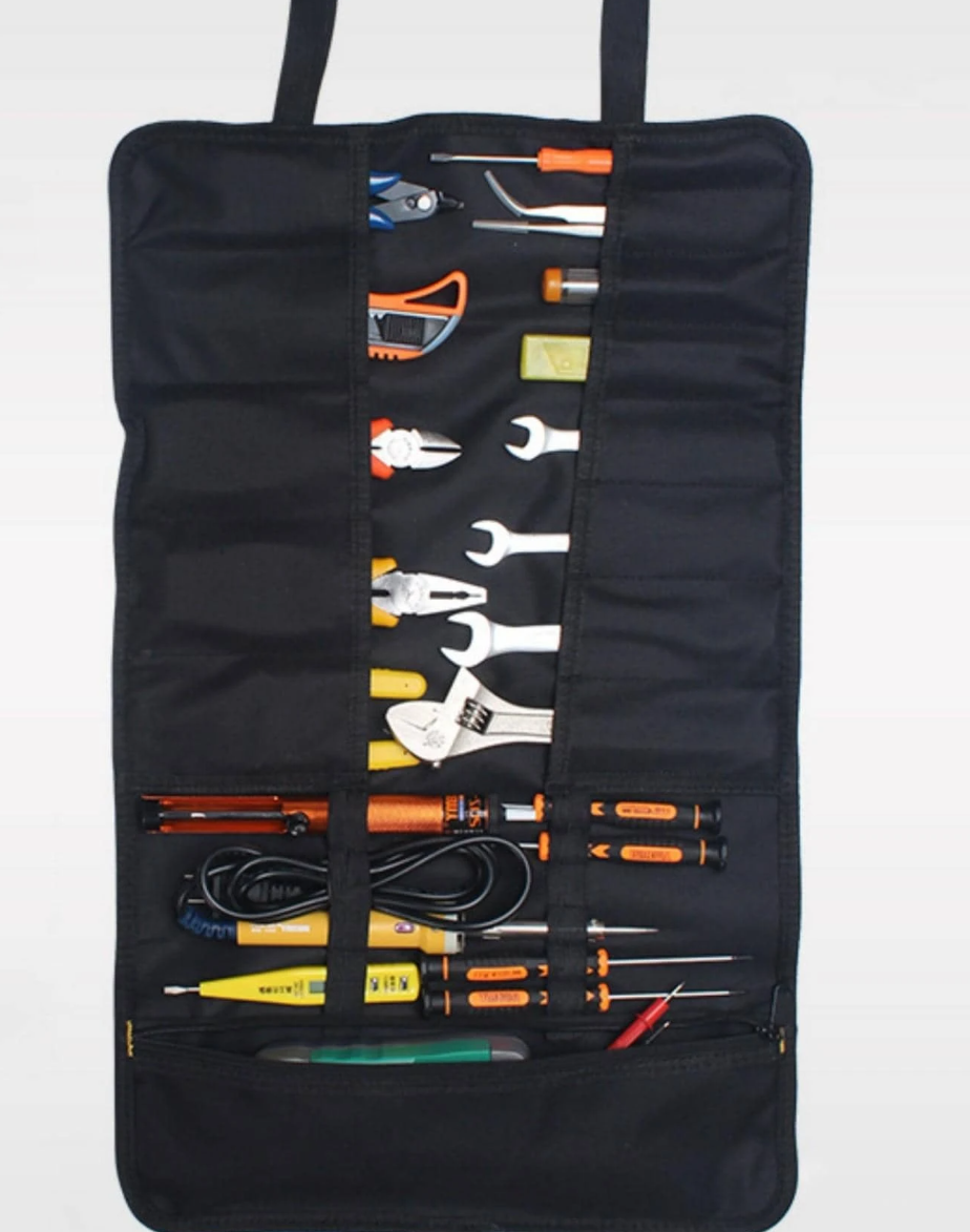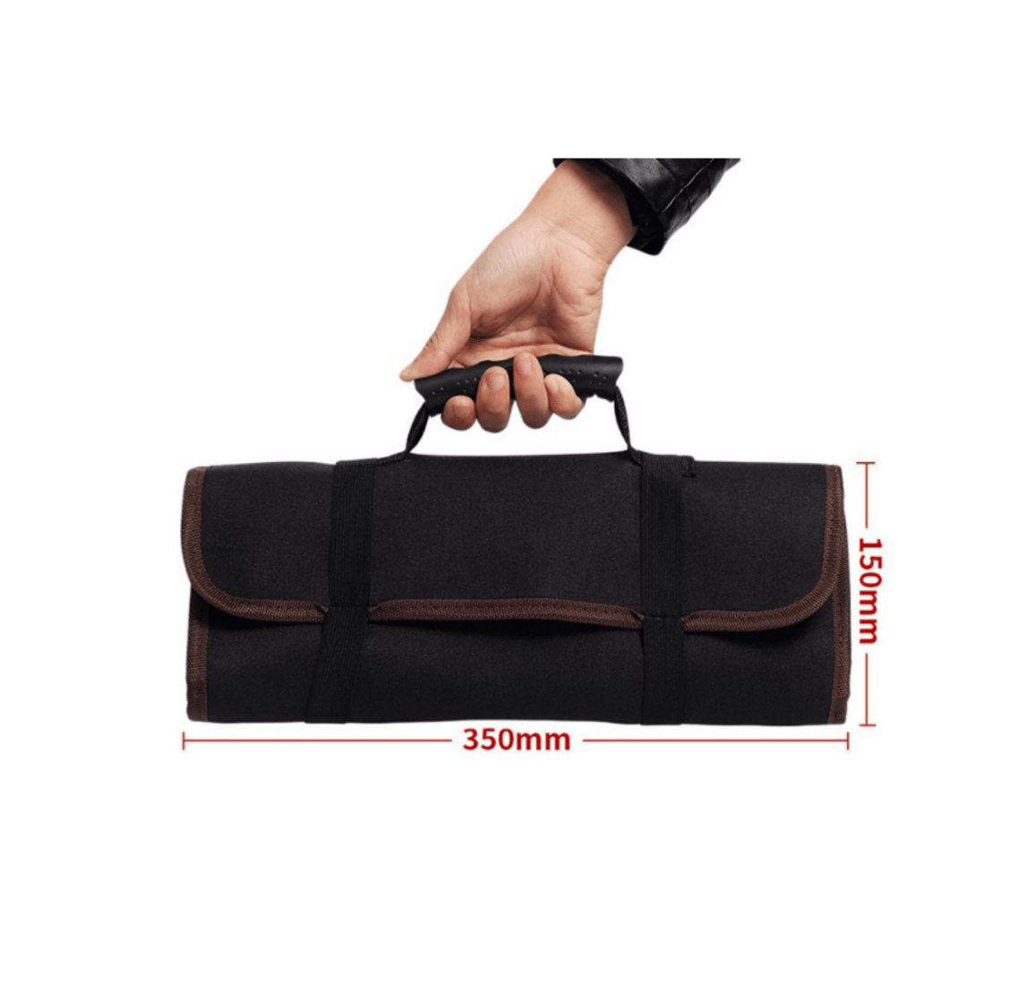 Лесен за навиване и пренасяне: Две еластични ленти затварят органайзера за инструменти, когато се навива, така че инструментите да не изпадат. Удобен е и има дръжка отгоре за лесно пренасяне.
