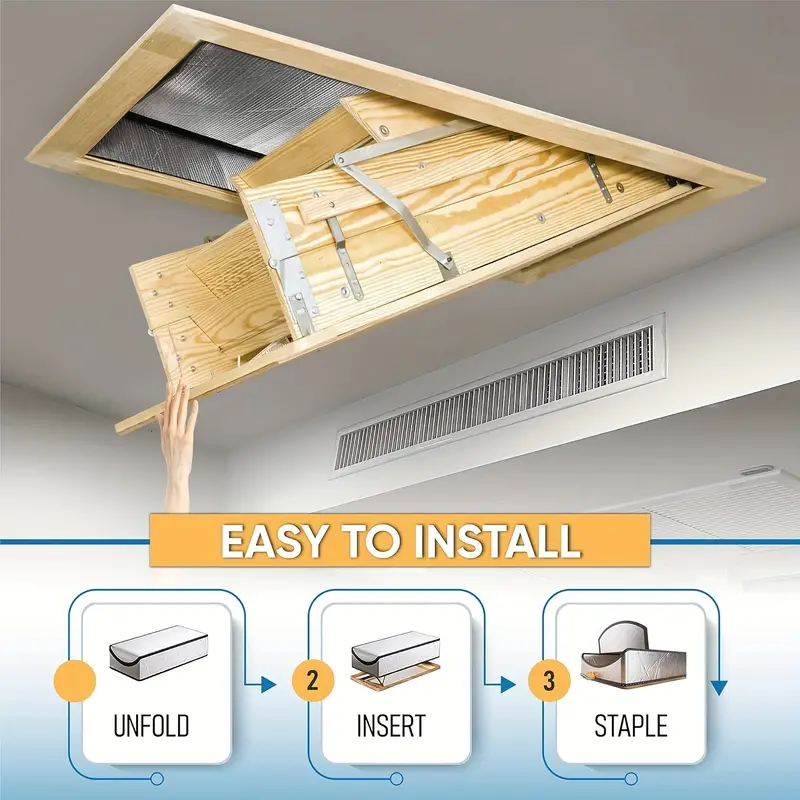 Монтирането на това изолационно покритие за таванския люк е много лесно. Не са необходими специални инструменти, само телбод за фиксиране на изолационния ръкав на място. Подходящ за тавански отвори до 63,5x137x28 см.