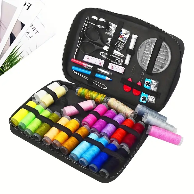 Макари за конци, игли за мъниста, копчета, ножици, рулетка - всичко е включено! Нашият преносим комплект за шиене съдържа всичко необходимо за вашите шивашки дейности и проекти, включително първокласен молив за плат! Всичко е спретнато организирано в платнена торбичка с цип, много по-практична от обемиста кутия за шиене.