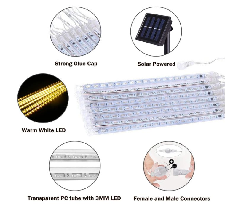- Икономия на енергия: без обществен източник на електричество, без допълнителни разходи за електричество и без нужда от смяна на батерията от падащи метеорни светлини, мощност по-малка от 0,06 W, продължителност на живота 15 000 H, LED мъниста, само 4 до 6 часа за пълно зареждане и до 8 часа за украса