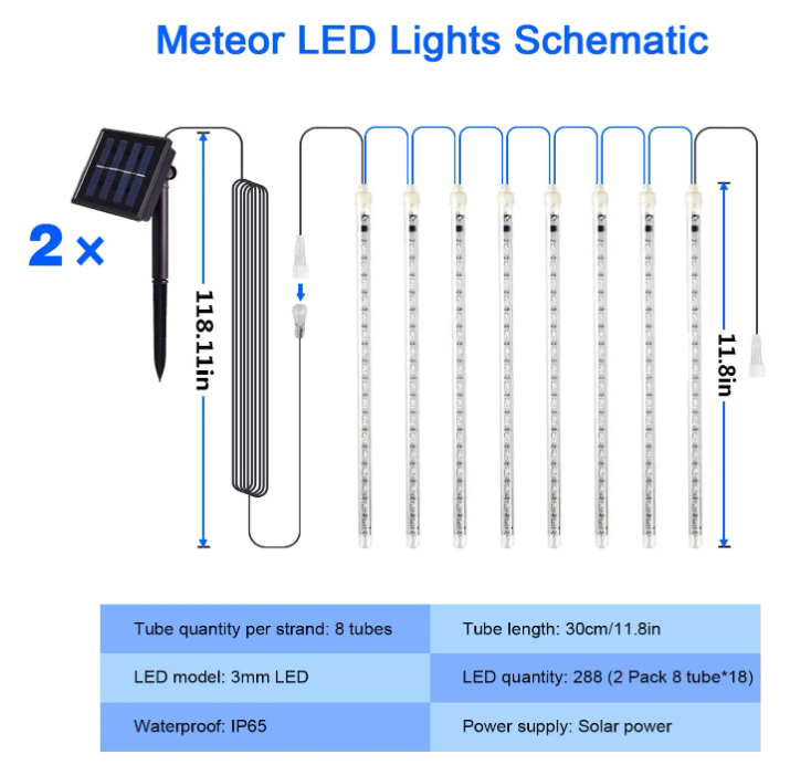 - IP65 Водоустойчивост: LED ваканционните външни слънчеви метеоритни светлини са направени от издръжливи и гъвкави гумени проводници с нечупливи пластмасови LED тръби, които са по-здрави от традиционното стъкло. По-важното е, че те са водоустойчиви, през зимен сняг и летни бури, те все още работят като часовник