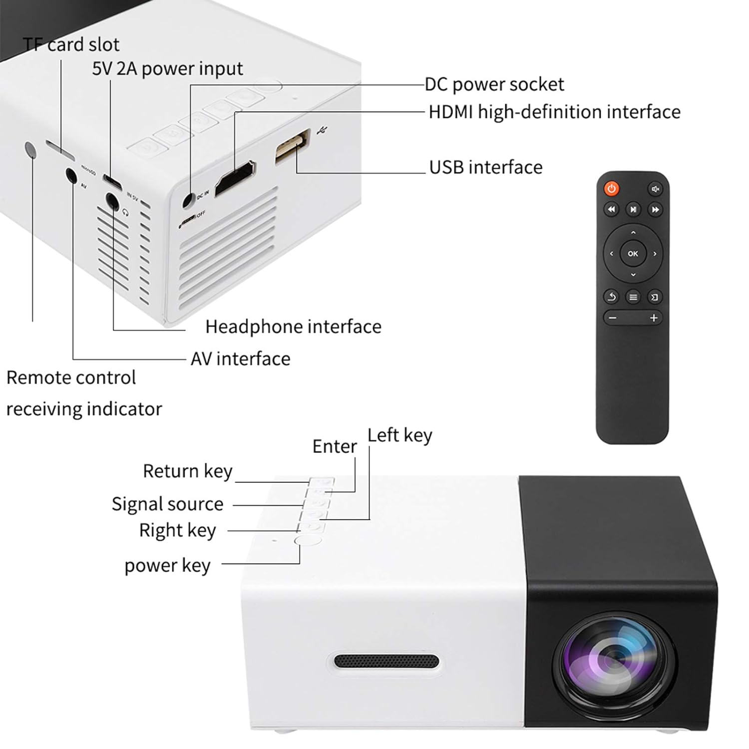 Множество входни интерфейси: Този проектор разполага с HDMI, AV, VGA, USB портове и слот за карта с памет, което му позволява лесно да се свързва с различни медийни устройства като телевизионни приемници, лаптопи, настолни компютри, цифрови фотоапарати, устройства, които поддържат Miracast и др. . Той ви дава множество начини да се наслаждавате на любимото си видео съдържание.
