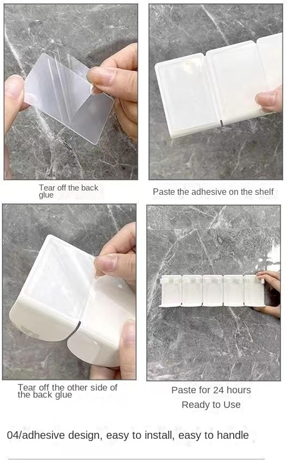 - Този стенен рафт ви помага да увеличите максимално пространството за съхранение, без да заема място на плота. Отлепете лепилото и го залепете до мивката или душа за лесен достъп до вашите продукти за грижа за кожата.