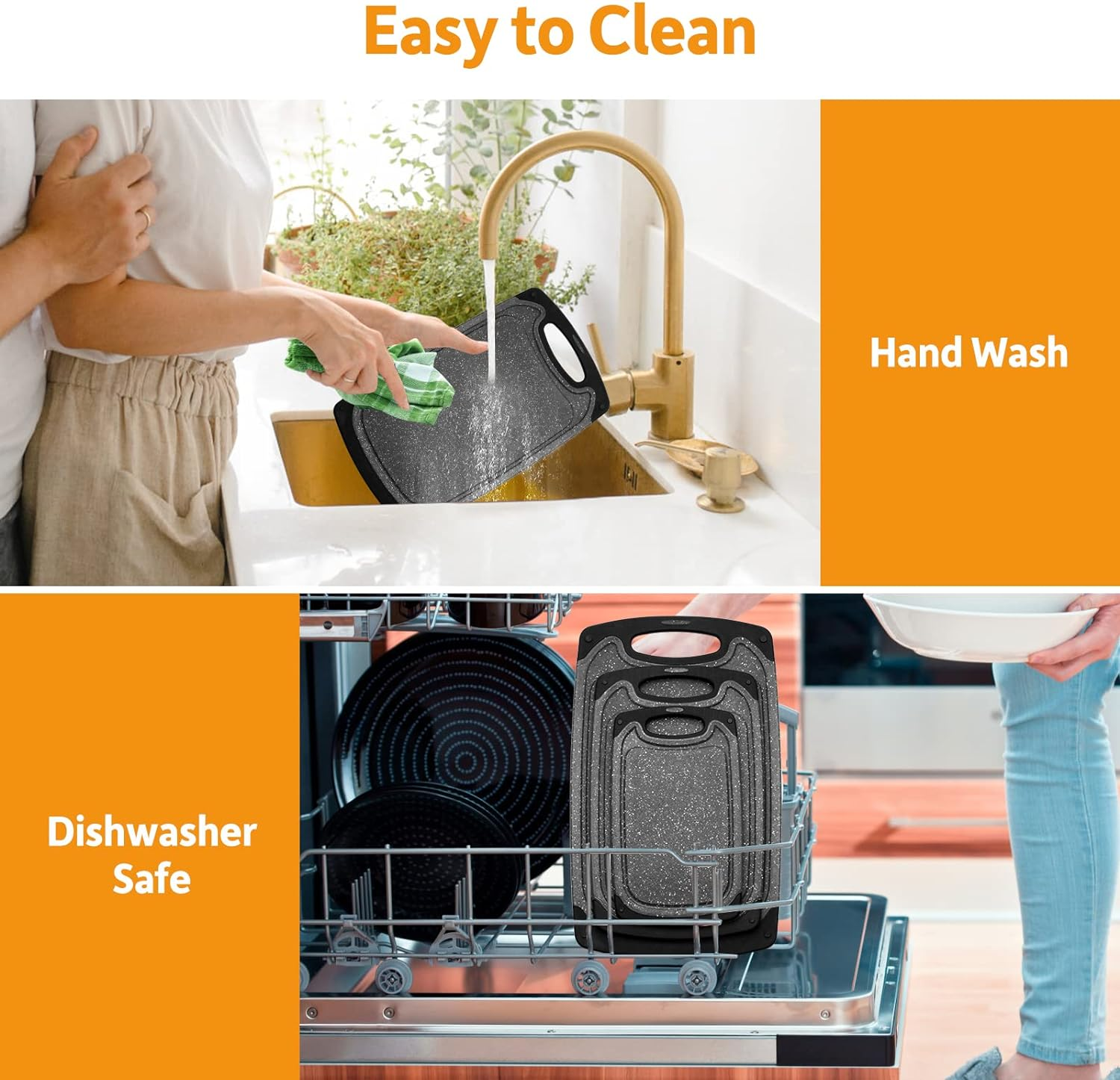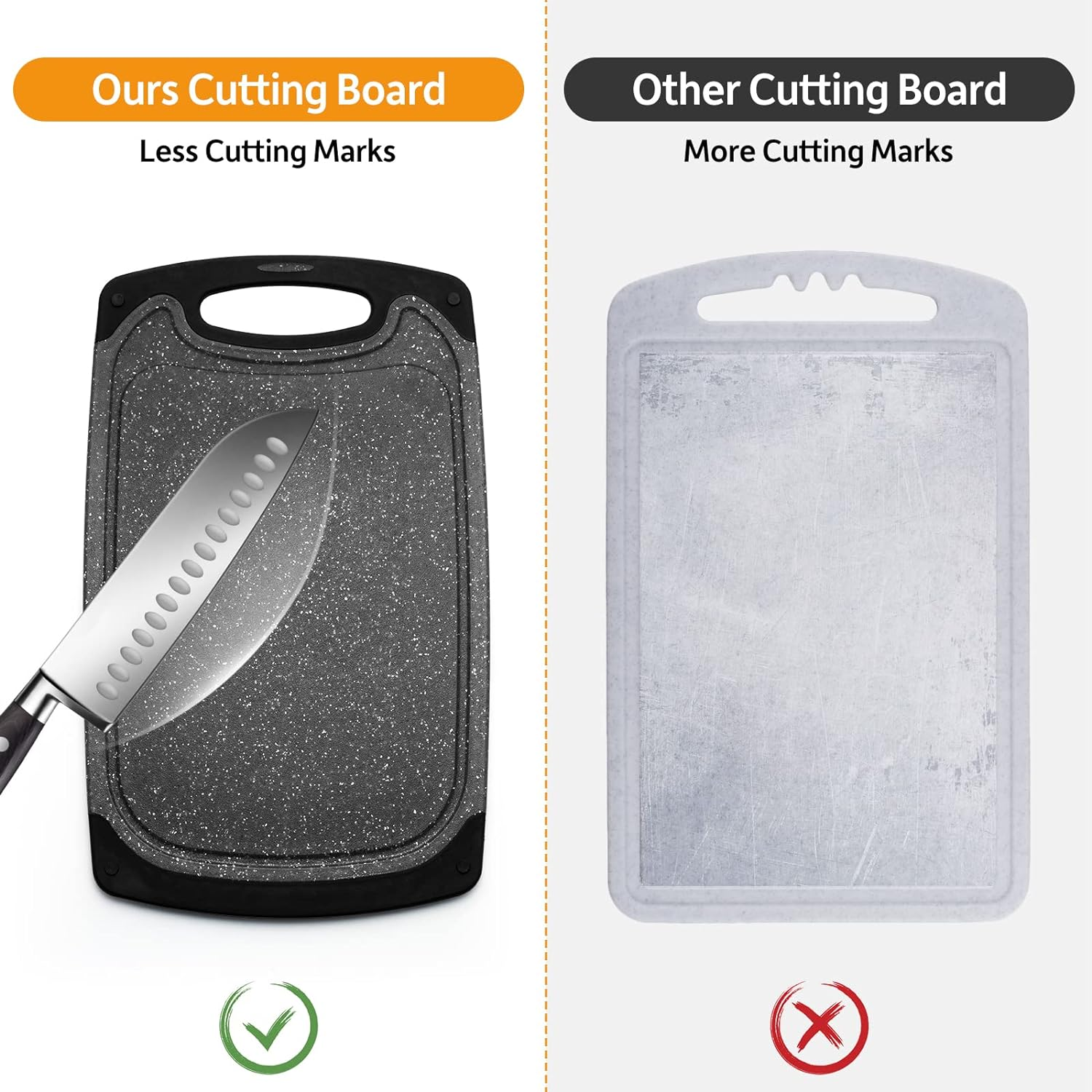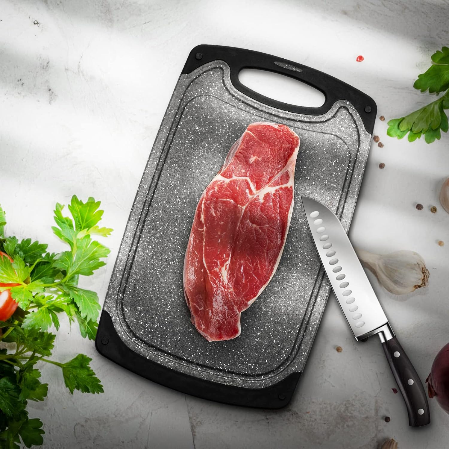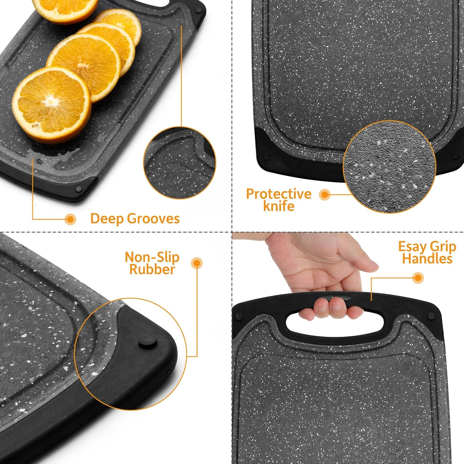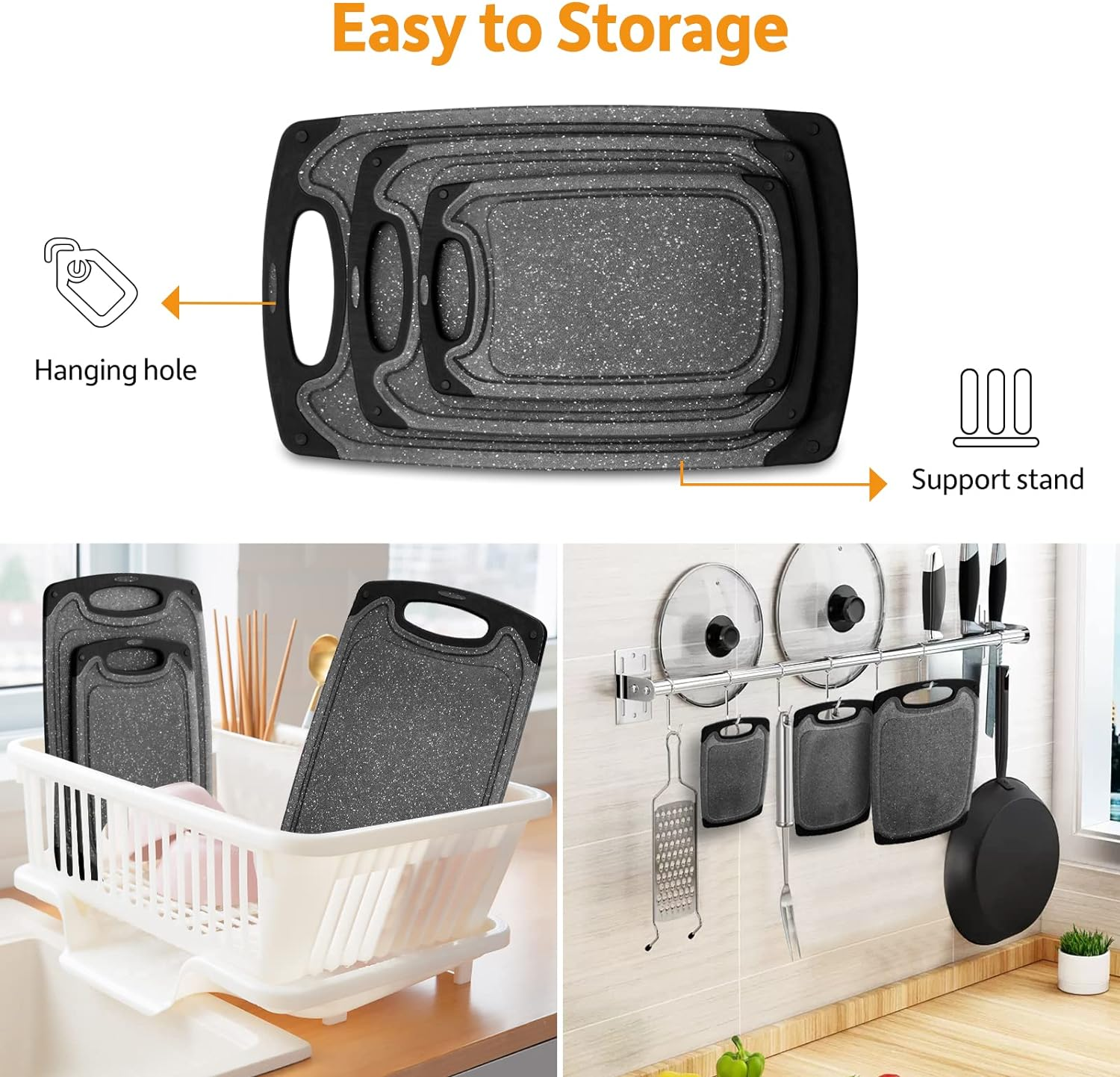 Усъвършенстван дизайн: С канал за сок, разположен около тавата за рязане, соковете или течностите, произведени по време на рязане на храна, ще се събират в нея, така че да не се разлее върху кухненския плот. С нехлъзгащи се гумени подложки, интегрирани във всяка тава за рязане, тавата няма да се движи или плъзга, което позволява по-гладко и безопасно рязане.