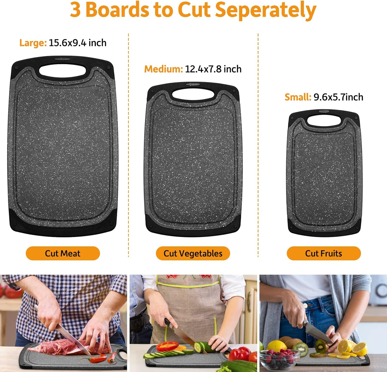 Професионален комплект тави за рязане: Трите тави са идеални аксесоари за кухненски плотове. Можете да използвате различни тави за рязане на риба, месо, плодове и зеленчуци. Разделянето на сурови и сготвени храни прави вашата храна по-здравословна. Голяма тава за рязане е с размери 39 x 24 см. среден тиган е с размери 31 x 20 cm; малка тава с размери 25 х 15 см.