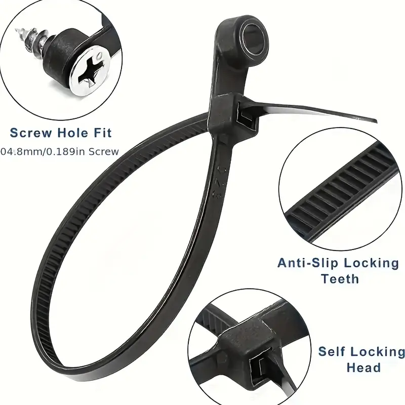 - Самозаключващата се система и отворът за винт държат кабелите здраво на място, като ги предпазват от изплъзване или разхлабване с течение на времето.