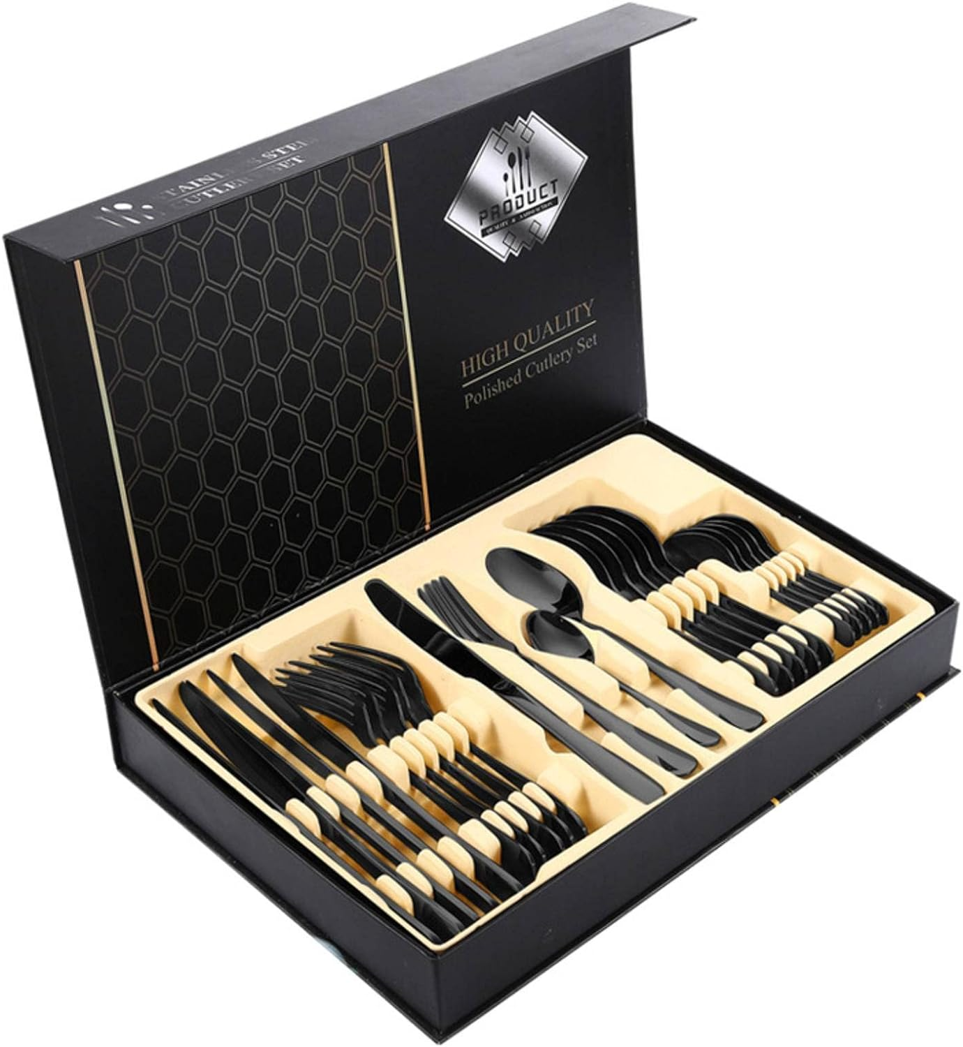 - Комплект прибори за хранене от 24 части включва по 6 броя: лъжици, вилици, ножове, чаени лъжички, опаковани в красива подаръчна кутия, идеално домакинство, коледен подарък