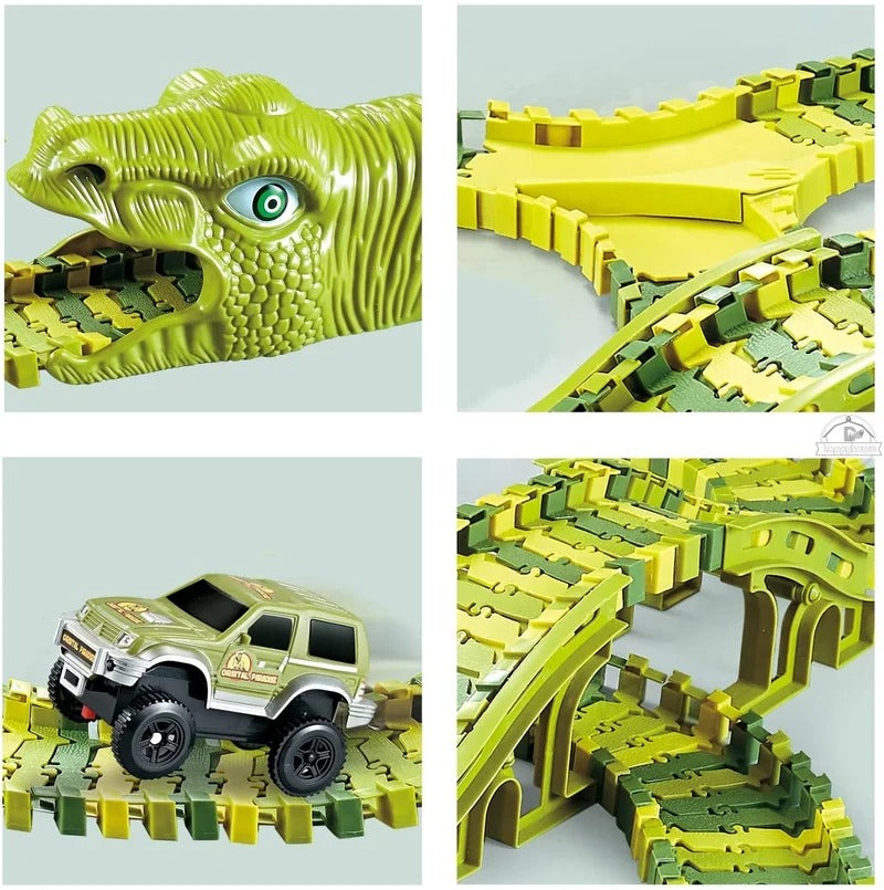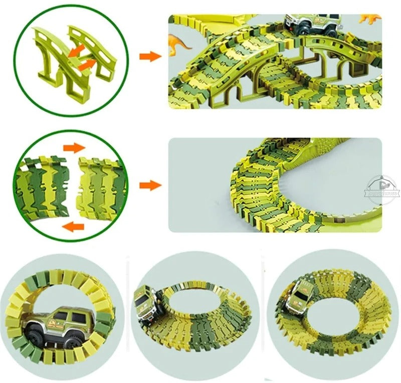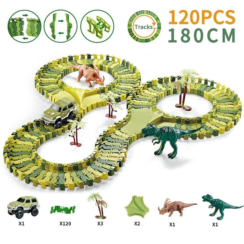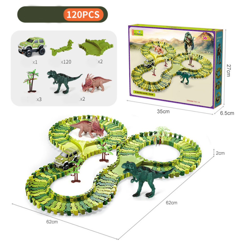Със стотици части и модели на писти, този комплект писти за динозаври позволява на вашето дете да изгради своя собствена персонализирана писта със завои, рампи и тунели, всичко това в ерата на динозаврите!