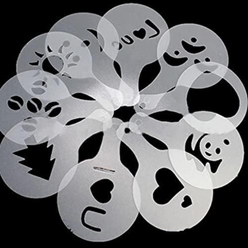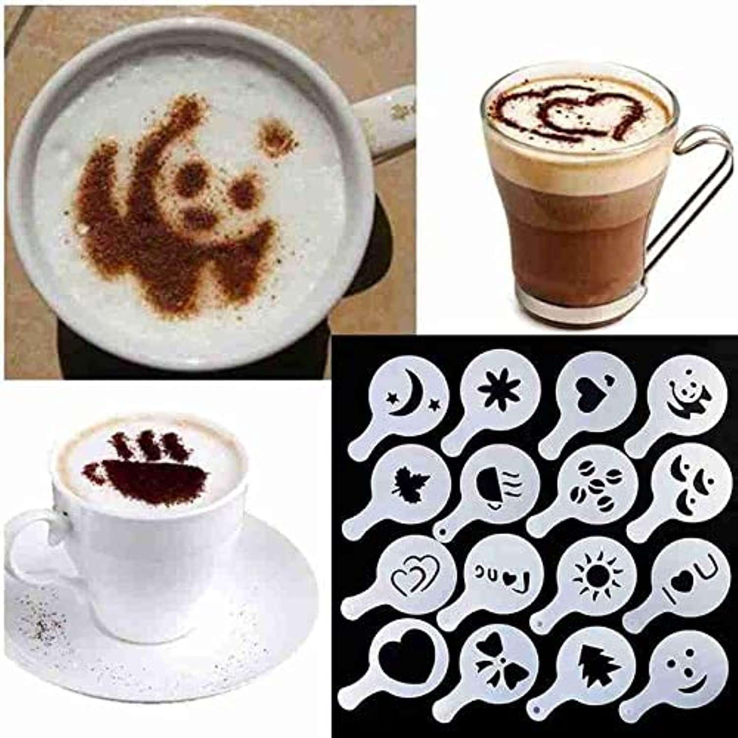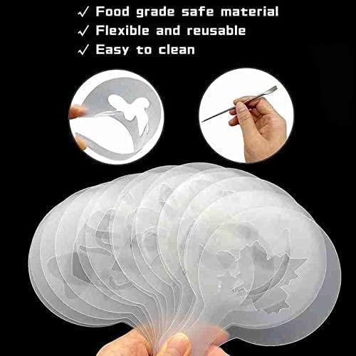 ☕Различни дизайни: Пластмасови шаблони за капучино/бариста с 16 различни дизайна, включително коледно дърво, усмихнато личице, кленов лист, слънце, кафеени зърна, сърца, панда, цвете и др. С химикалката за кафе можете лесно да рисувате шарки върху вашето кафе.