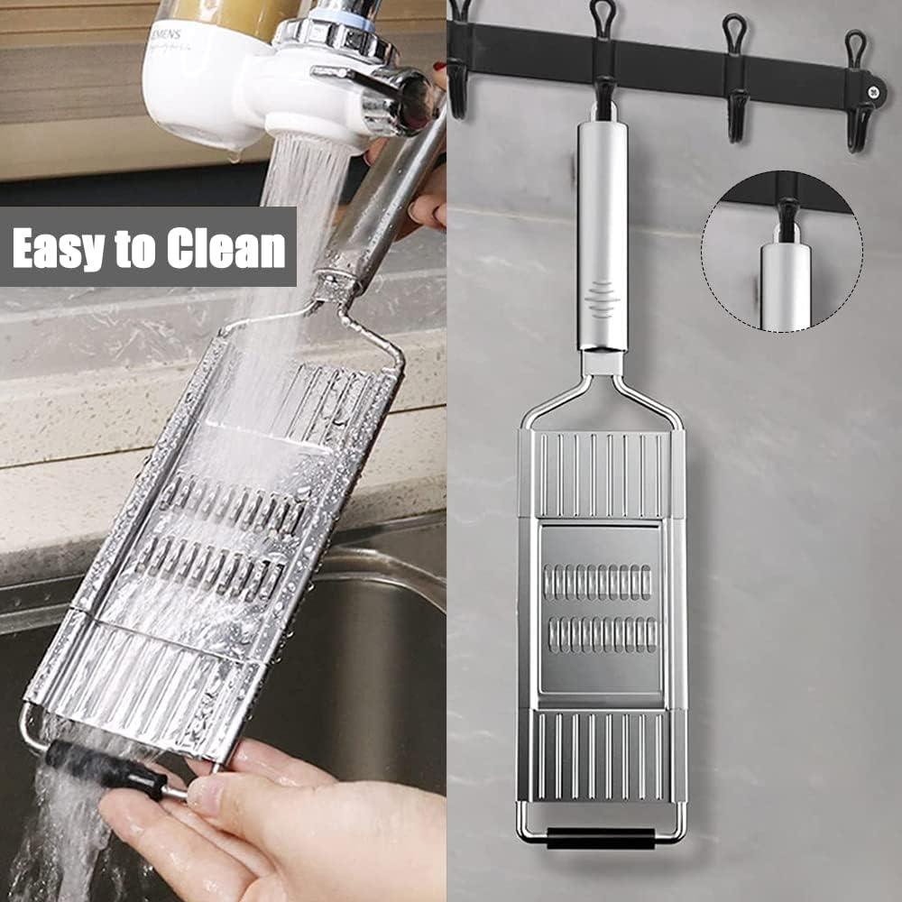 Издръжлив материал: Универсалната резачка за зеленчуци е изработена от неръждаема стомана, лесна за почистване и подходяща за съдомиялна машина. Многофункционалното ренде 4 в 1 е здраво, устойчиво на корозия, безопасно и издръжливо, което гарантира автентичен вкус на вашата храна.