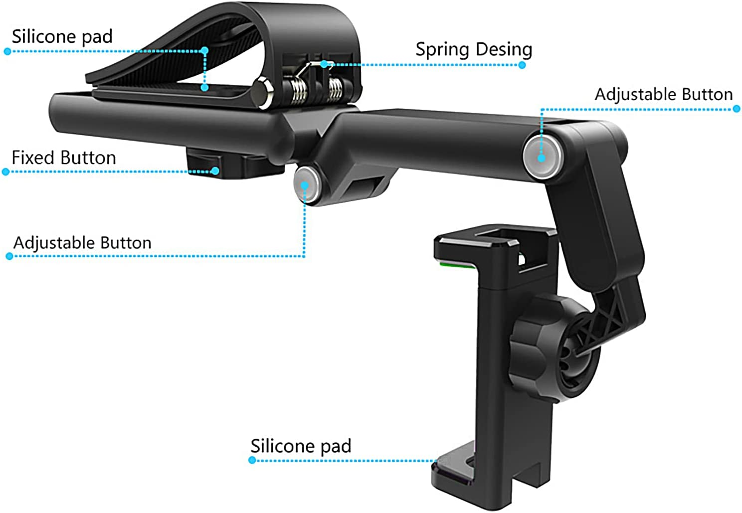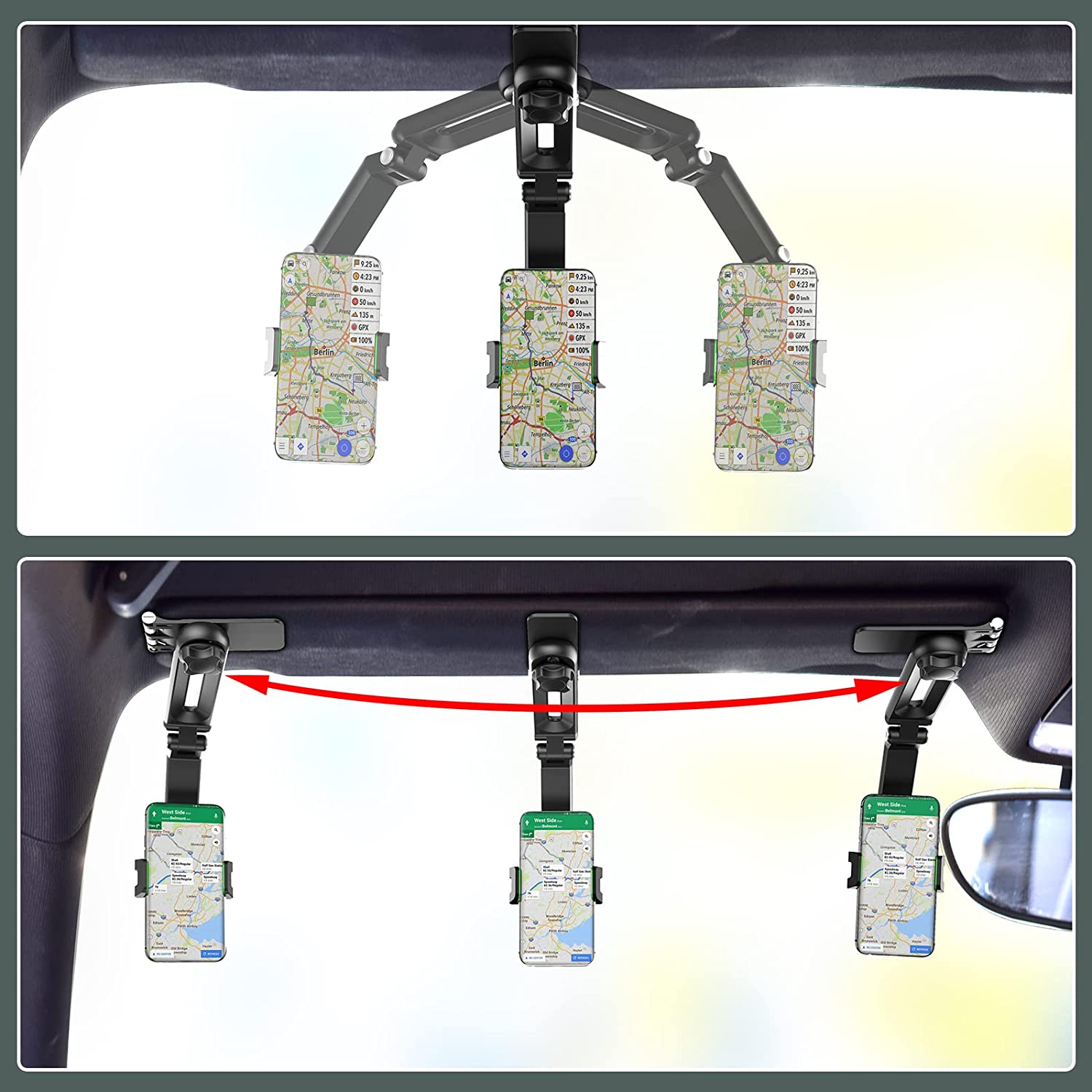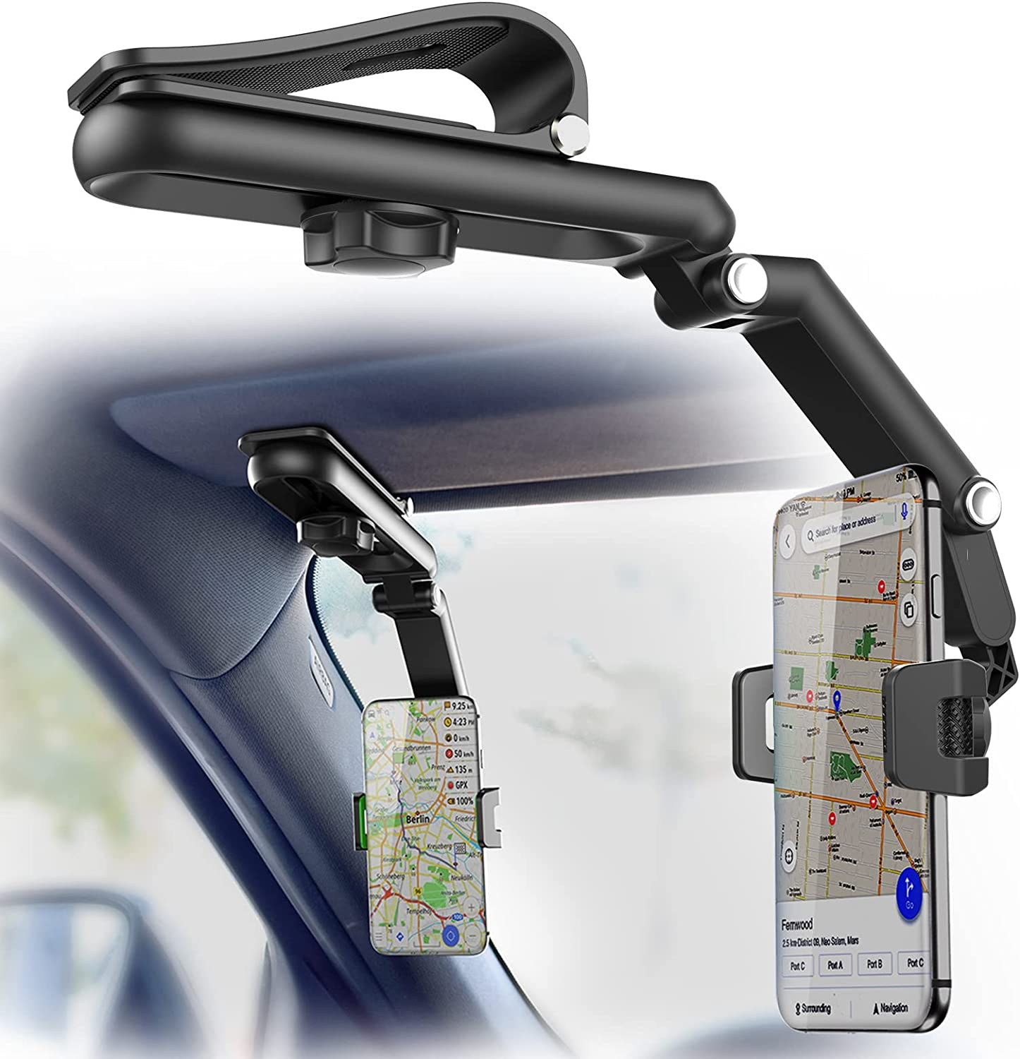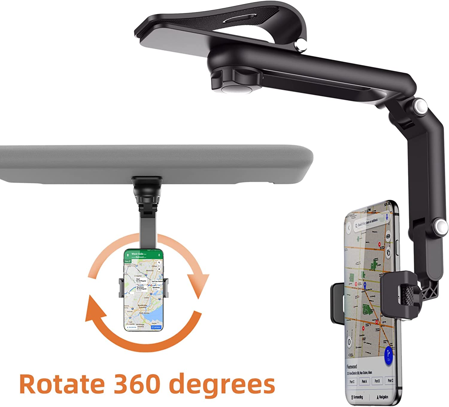 【Регулируемо телескопично рамо】Върти се нагоре и надолу на 360 градуса за най-благоприятни позиции, независимо дали е монтирано върху сенника или огледалото за обратно виждане; Телефонът може да се върти в пейзажна и портретна ориентация; Предотвратете запушването на зрението по време на шофиране.