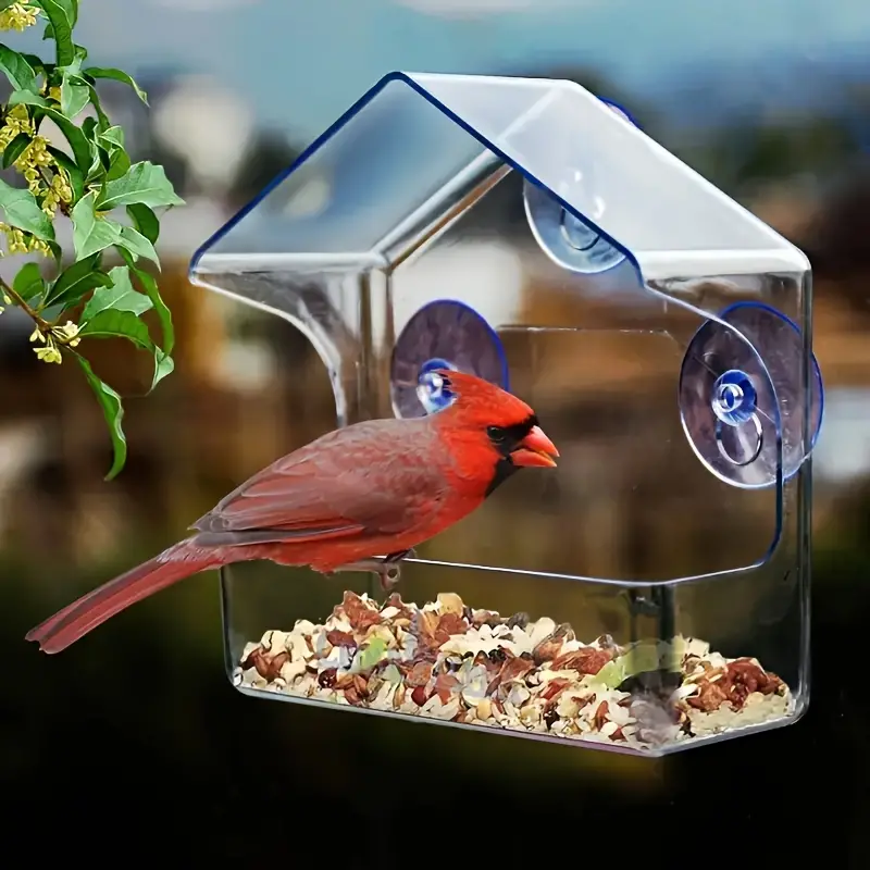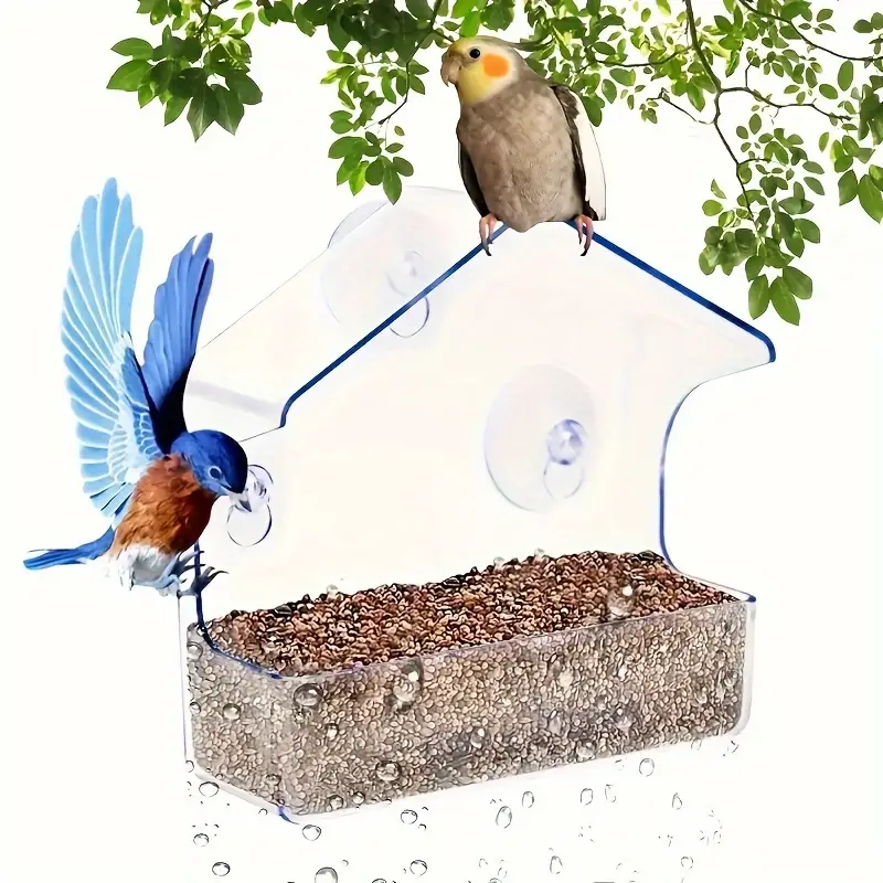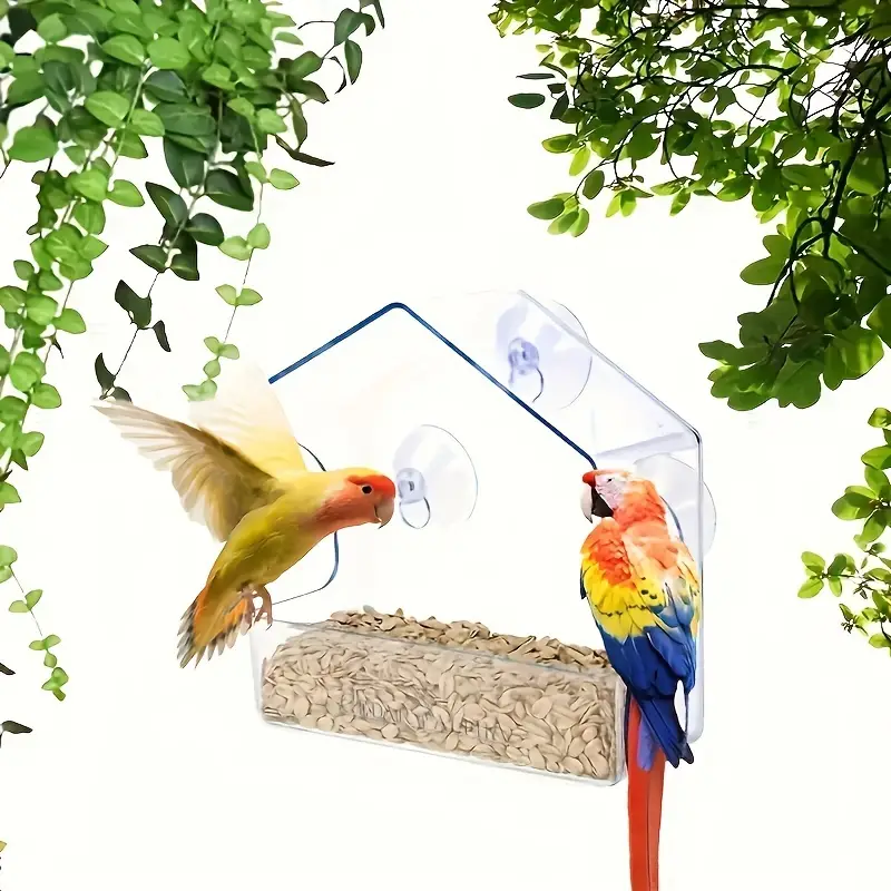АКРИЛНИ ХРАНИЛКИ ЗА ПТИЦИ: Изработена от висококачествен прозрачен акрил, хранилката за птици с форма на колибка гарантира дълготрайна издръжливост. С размери 21.5x20.5x10cm, той предлага просторно убежище за птици, което може да издържи на различни външни елементи. Тази солидна структура осигурява безопасно и надеждно място за хранене, като приканва птиците да се насладят на храната в комфорт.