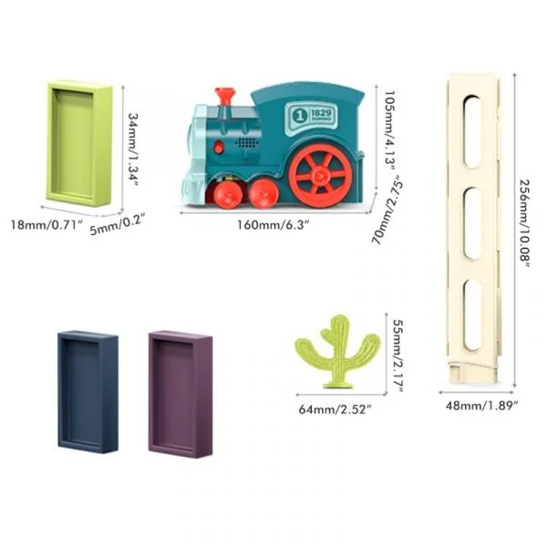 - КОМПЛЕКТ ИГРАЧКИ ДОМИНО ВЛАК: Състои се от 60 малки блокчета и влакче и се предлага в красива кутия. Децата ще използват блокове и малки влакчета, за да играят въображението и креативността си, самостоятелно да изпълняват различни маршрути на домино и след това да ги бутат. Изисква използването на 2" AA батерии (не са включени)